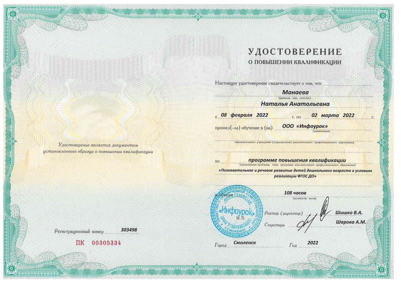 Курсы повышения квалификации " Познавательное и речевое развитие детей дошкольного возраста в условиях реализации ФГОС ДОУ" 02 марта 2022 г.